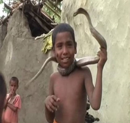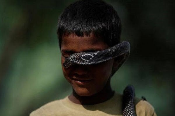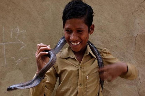 সাধারণত আশপাশের সামান্যতম শব্দ বা শরীরে কারও স্পর্শ পেলেই সঙ্গে সঙ্গে ফণা তুলে ছোবল মারতে উদ্যত হয় বিষাক্ত গোখরো বা গোক্ষুর। কিন্তু যেই কালফণীকে দেখে অতি সাহসী লোকও লাফিয়ে নিরাপদ দূরত্বে গিয়ে দাঁড়ায়- তেমন প্রাণীকে প্রায় দুগ্ধপোষ্য শিশুরা হাতে নিয়ে খেলছে, বিরক্ত করছে নানাভাবে। অথচ সাপগুলো যেন শান্ত খরগোশের মতো আচরণ করে। এমন দৃশ্যও দেখা যায়! পাঠকদের জন্য তেমনি কিছু দুর্লভ ছবি এখানে দেওয়া হলো।