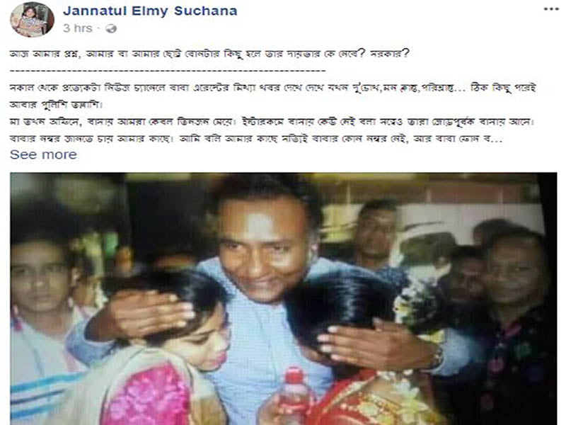 এদিকে বিকেল সোহেলের মেয়ে তার বাবার ‘আটক’ ও পুলিশি তল্লাশি নিয়ে ফেসবুকে একটি স্ট্যাটাস দেন।