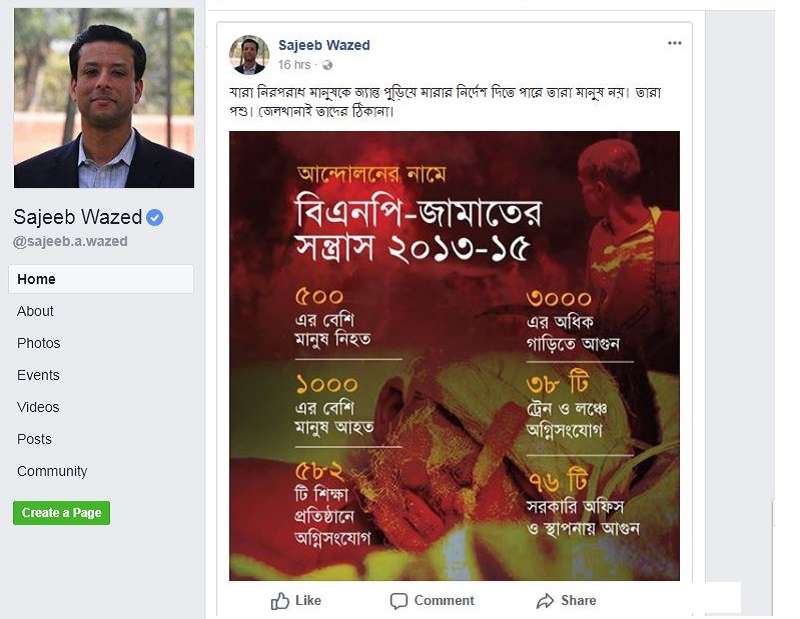 বৃহস্পতিবার (৮ ফেব্রুয়ারি) তাঁর ফেসবুকের পাতায় দেওয়া একটা পোস্টে এসব কথা বলেছেন তিনি। এরপর একটি ছবিতে ‘আন্দোলনের নামে বিএনপি-জামাতের সন্ত্রাস ২০১৩-১৫’ পরিস্থিতি তুলে ধরেন।