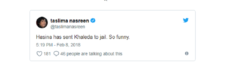 এদিকে, লন্ডনে বসবাসকারী বাংলাদেশি লেখিকা তসলিমা নাসরিন- জিয়া অরফানেজ ট্রাস্ট দুর্নীতি মামলার রায়ে বিএনপি চেয়ারপারসন বেগম খালেদা জিয়ার জেল সম্পকে তার টুইটার অ্যাকাউন্টে ইংরেজিতে টুইট বার্তা দিয়েছেন। তা হলো-