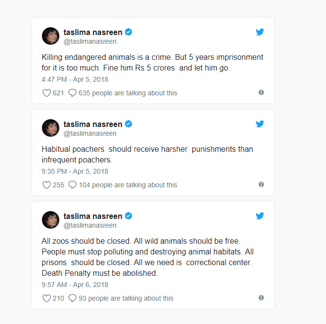এই টুইটের কয়েক ঘণ্টা পর তসলিমা আরও একটি টুইটে লিখেন, ‘হুট করে পশু হত্যাকারীদের চেয়ে পেশাদার চোরাশিকারীদের কঠোর সাজা হওয়া উচিত।’