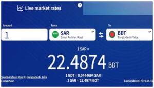 আজ ১৭ এপ্রিল SAR (সৌদি রিয়াল রেট) ১ = ২২.৪৮৭৪৳ (তথ্যটি ইনটারনেট থেকে নেওয়া হয়েছে)। গতকাল ১৬ এপ্রিল SAR (সৌদি রিয়াল রেট) ১ = ২২.৪৬৭১৳