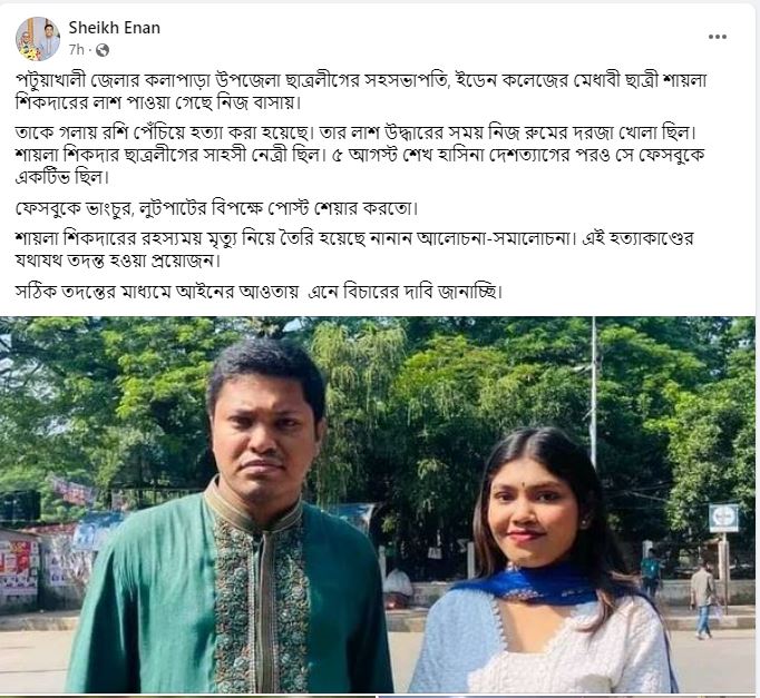 শায়লা শিকদার ছাত্রলীগের সাহসী নেত্রী ছিল। ৫ আগস্ট শেখ হাসিনা দেশত্যাগের পরও সে ফেসবুকে একটিভ ছিল। ফেসবুকে ভাংচুর, লুটপাটের বিপক্ষে পোস্ট শেয়ার করতো। শায়লা শিকদারের রহস্যময় মৃত্যু নিয়ে তৈরি হয়েছে নানান আলোচনা-সমালোচনা। এই হত্যাকাণ্ডের যথাযথ তদন্ত হওয়া প্রয়োজন। সঠিক তদন্তের মাধ্যমে আইনের আওতায় এনে বিচারের দাবি জানাচ্ছি।